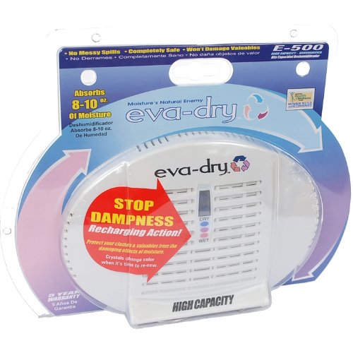 This high capacity renewable dehumidifier has been designed to adsorb moisture from small, enclosed areas. It will help protect clothes and valuables from the damaging effects of mold/mildew and moisture rot. It is 100% renewable and needs no power to operate. Just hang the Eva-dry unit in a closet, or you can place it in other small, enclosed spaces, and it will start to adsorb moisture. There are no batteries required or cords to plug in, the unit works without power. There is an indicator window with special "moisture meter crystals" that change from blue (when dry) to pink (when wet) to indicate when the unit needs to be "renewed". The unit will adsorb approximately 8-10 ounces of moisture (depending on humidity levels this should take between 6 - 8 weeks). Once the moisture has been adsorbed it cannot leak or spill. This unit uses a specialized, engineered, crystallized silica gel that is odorless, non-toxic and completely safe. When the indicator crystals turn pink it is time to "re-new" the unit. Simply remove the unit from where it is adsorbing moisture and plug it into a power outlet or power strip in a well ventilated area (bathroom with extraction fan, garage, outside, etc.). There is a built-in heater that will warm the crystals allowing them to expand and release the moisture as water vapor into the outside air. It takes about 12-14 hours to completely re-new the unit. When it is completely renewed the indicator crystals will change back to blue. The unit is brand new again and ready to adsorb another 8-10 ounces of moisture.The crystals will remain active for 10 years and we offer a 5 year limited manufactures warranty on all EDV500 units.